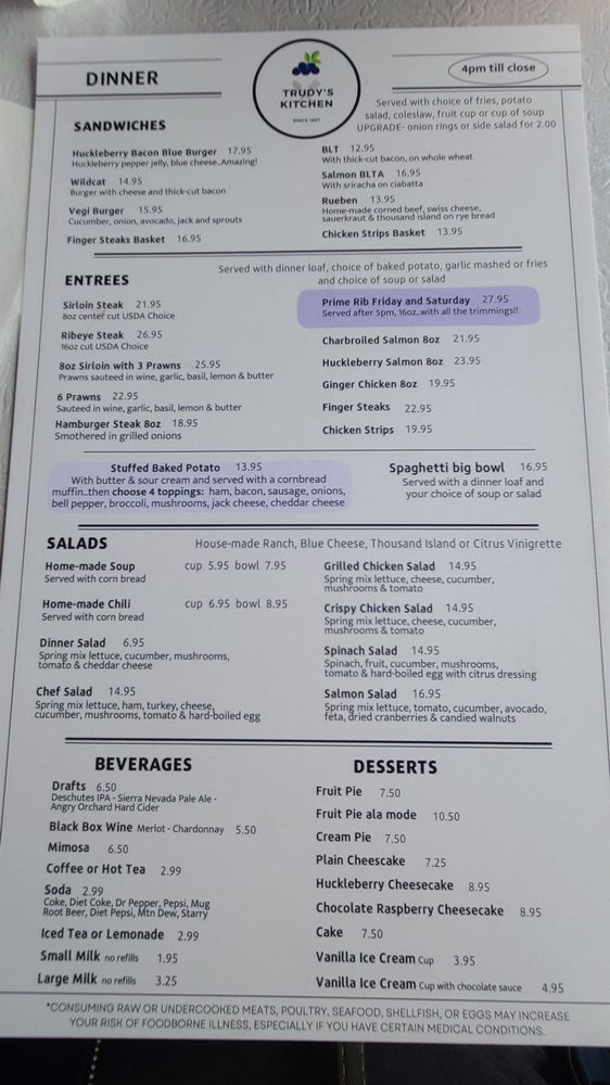 Welcome to Trudy's Kitchen, a delightful diner specializing in breakfast, brunch, and family-friendly meals. Nestled in Idaho City, this inviting café not only serves favorites like the classic Ruben and indulgent Huckleberry bacon burgers but also boasts a diverse menu with many vegetarian options. With a commitment to accessibility, Trudy's Kitchen features ADA-compliant facilities and is equipped for takeout and delivery.